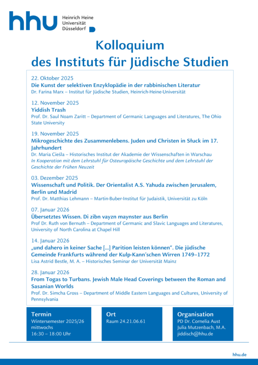 Das Institut für Jüdische Studien lädt herzlich zum Kolloquium im Wintersemester 2025/26 ein.
